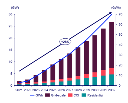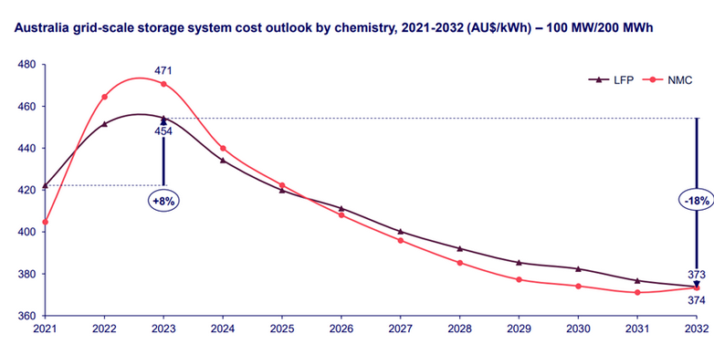 With energy storage projects deployed in Australia mainly targeting the high-value frequency control and ancillary services (FCAS) market, grid-scale battery energy storage systems with a duration of two hours are currently the mainstream energy storage technology. By 2032, the prices of lithium iron phosphate batteries (LFP) and NMC ternary lithium-ion batteries are expected to drop by more than 40%. This in turn will drive battery storage system costs down 18% to 21% over the next decade, making it the biggest driver of capital spending cuts.